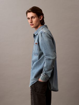 From Calvin Klein Studio in partnership with Cone Denim. Iconic silhouettes transformed in premium cotton. The streamlined button-down in heavyweight denim.