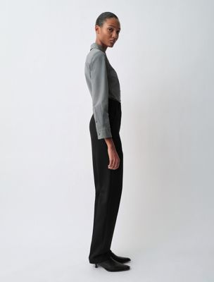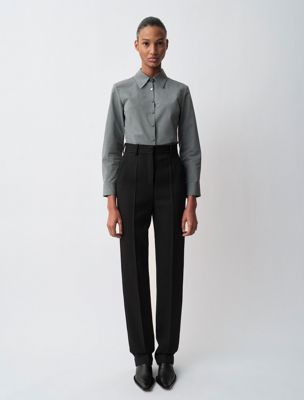 Slim high-waisted trousers cut from 100% textured wool gabardine. Defined by sharp front and back creases, they offer a polished and tailored finish.